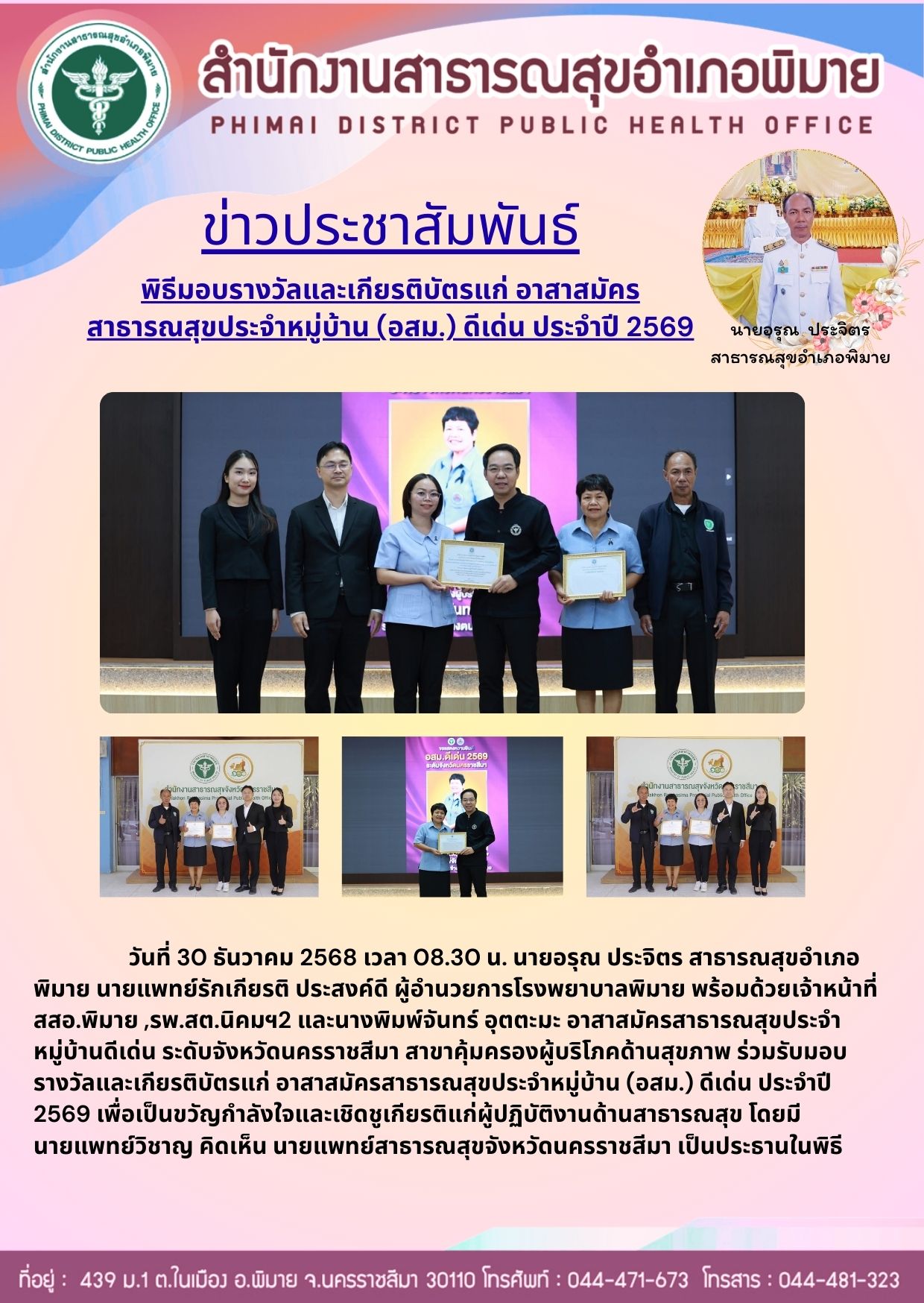 ประกาศผลการคัดเลือกอาสาสมัครสาธารณสุขประจำหมู่บ้าน (อสม.) ดีเด่น ระดับอำเภอ ปีงบประมาณ 2568